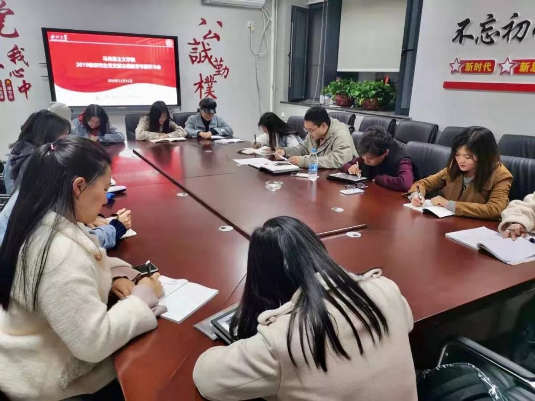 根据“不忘初心、牢记使命”主题教育领导小组印发的《关于开展第二批“不忘初心、牢记使命”主题教育的指导意见》,为落实校党委《西北大学关于“不忘初心、牢记使命”主题教育的实施方案》和马克思主义学院党委《“不忘初心、牢记使命”主题教育工作方案》的安排,我院2019级研究生党支部于11月21日晚,在西学楼1201党建活动室开展了“对党说句心里话”主题党日,并进行了主题教育专题学习会。会议由支部书记赵凯凯同志主持,支部全体党员、预备党员、入党积极分子和2019级共青团员代表参加了此次会议。