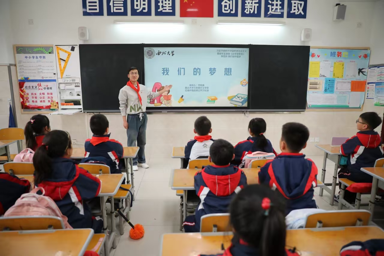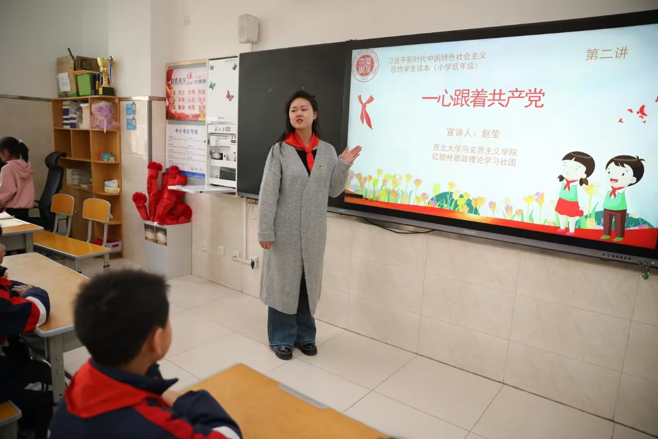 3月21日,我院红桅杆思政理论学习社团在西安航天城第四小学,以《习近平新时代中国特色社会主义思想学生读本》(小学低年级)为主要内容,为三年级的小学生讲授思政课。主讲人分别是来自2023级和2024级思想政治教育与中国近现代史基本问题研究专业的6名硕士研究生。
