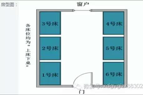 每个宿舍都是3和4号床靠窗,1和6号床靠门,2和5床中间, 上床下桌。