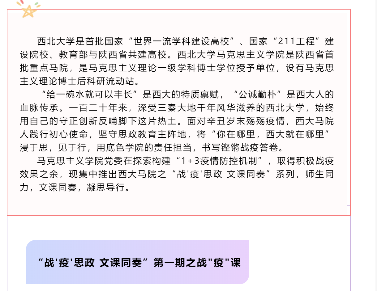 上一条:西大马院:战疫思政 文课同奏 第二期 下一条:马克思主义学院召开国家社科基金申报交流会议