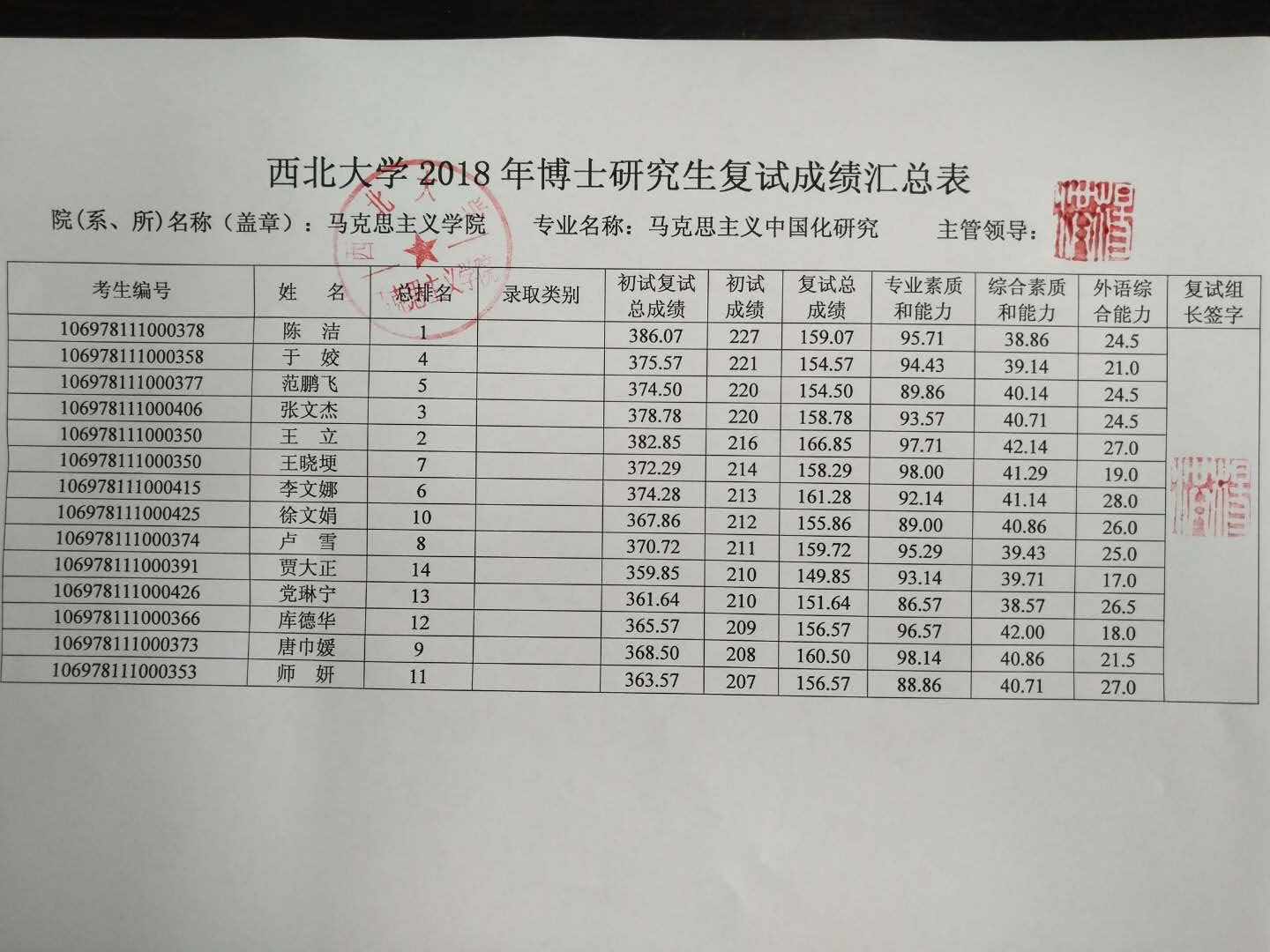 马克思主义学院2018年博士研究生复试成绩汇总表